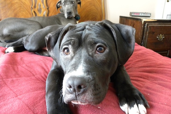 Her mother was a ‘Razor’s edge’ pitbull and her father was a Staffordshire terrier. We do have a picture of each of the parents. At about 5 months old, the girls are about 45 lbs each. In regards to personality, the girls are very different from one another. Thus, they are not extremely bonded and in separate foster homes. They are both doing well and waiting for their own happily ever after!