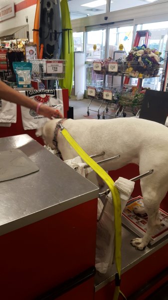 At 5 years old and 60 lbs, Missy, a STUNNING white American Bulldog and decorated CANINE GOOD CITIZEN! She always was and continues to be sweet and loving to whoever came to care for her, full of kisses and a yodeling bark. Missy is very affectionate- providing endless kisses and snuggles in bed. She loves to lay on your lap too!